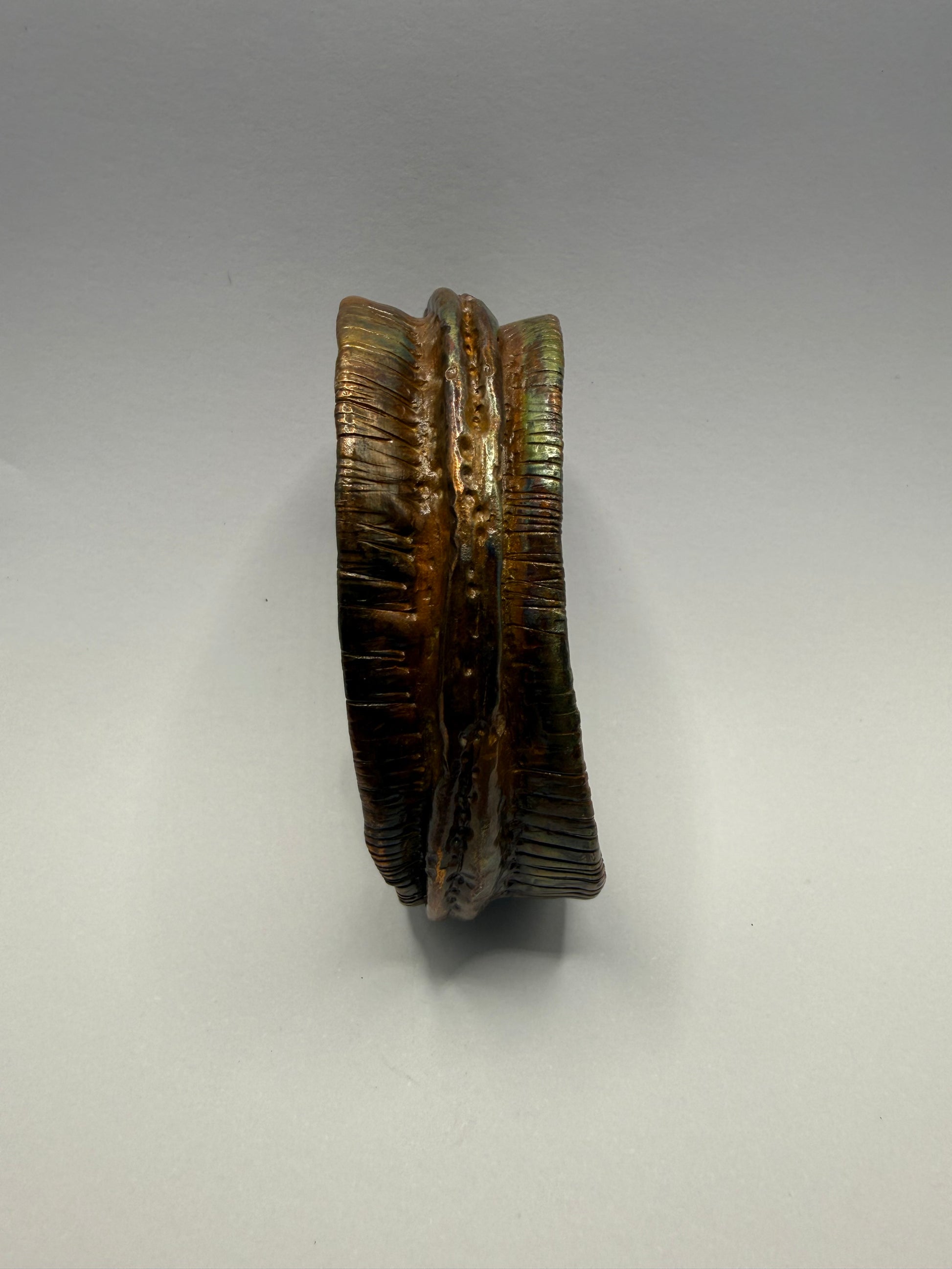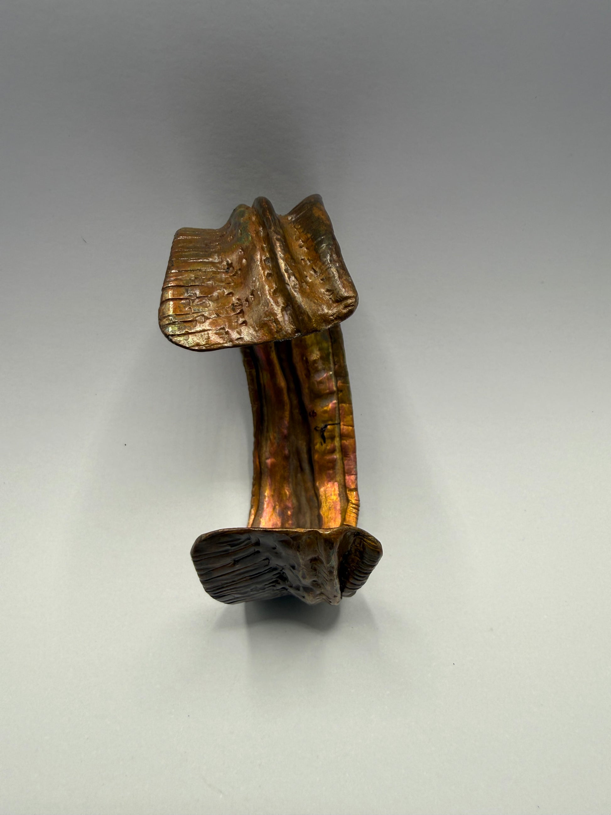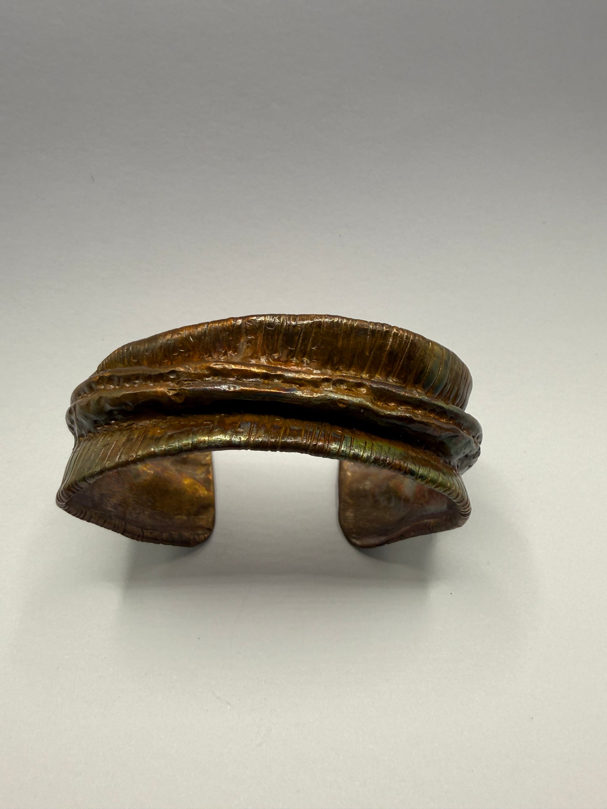 One of a kind copper bracelet. Created by hammering, fold forming and heat coloring. Top is sealed with automotive clear coat. Inner copper is bare. Measures 1” wide ar base, 3/4” top and 17 cm inner diameter. Fits wrists that measure 15.5-16.5 cm.